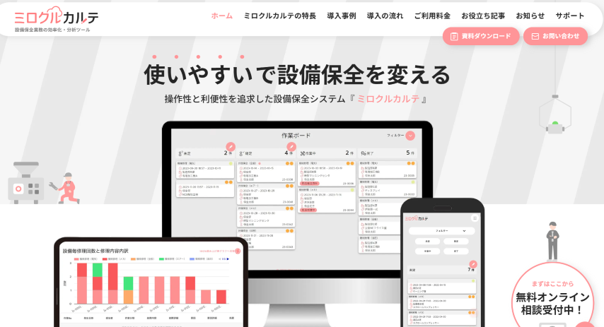 | ミロクルカルテ | クラウド(SaaS)のみ | QRで修理依頼・履歴管理 | 低コスト・改善活動向き |